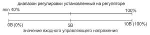 Пример. Вы встроенным потенциометром установили значение минимальной скорости вращения 40%. Это значит, что регулировка будет вестись в диапазоне 40%-100%. Теперь ВНИМАНИЕ!!! Фокус. Смотрим на нижнюю прямую: сигнал 0-10В, его можно также представить, как 0-100%.